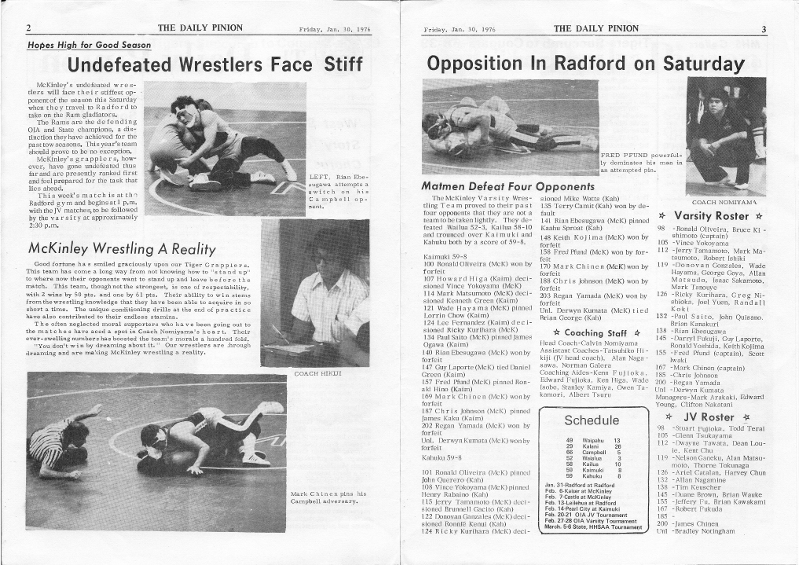 As the season opened, the young grapplers followed the varsity in defeating their first five opponents. Disappointments struck again with the clash against last year's JV champs, the Radford Rams and another loss to Kaiser, this year's OIA JV crown victors. A triumph over Castle, a close match against Leilehua, and a romp over the Pearl City Chargers concluded the team matches.